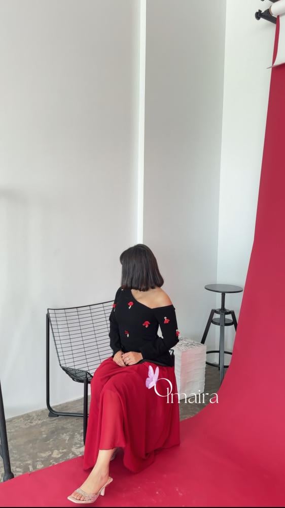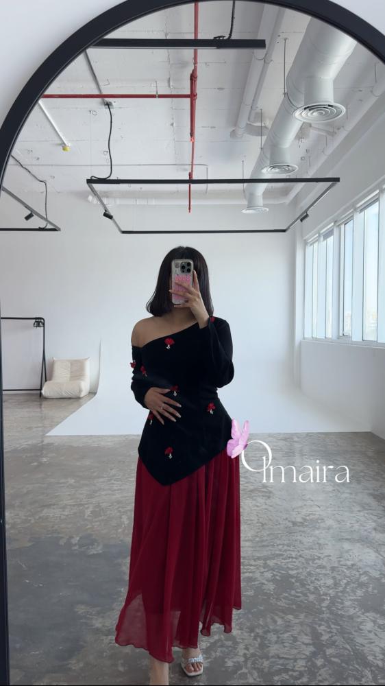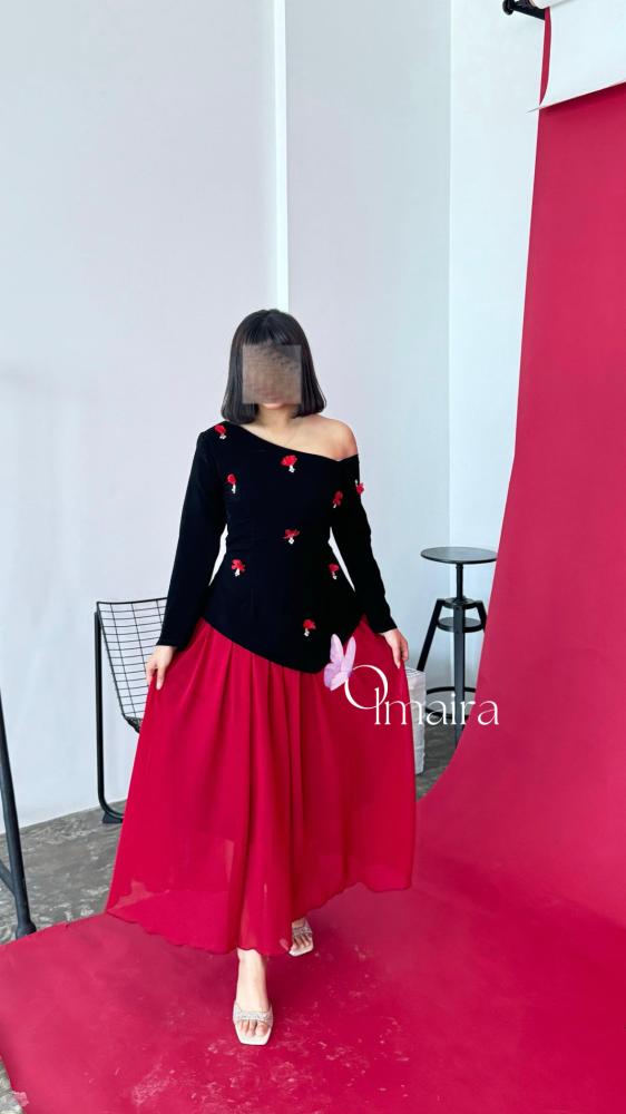 - يجمع اللون الأحمر الجريء مع الأسود الكلاسيكي في تناغم راقٍ يعكس الفخامة والأنوثة، مما يجعله مثاليًا للسهرات والمناسبات الخاصة.