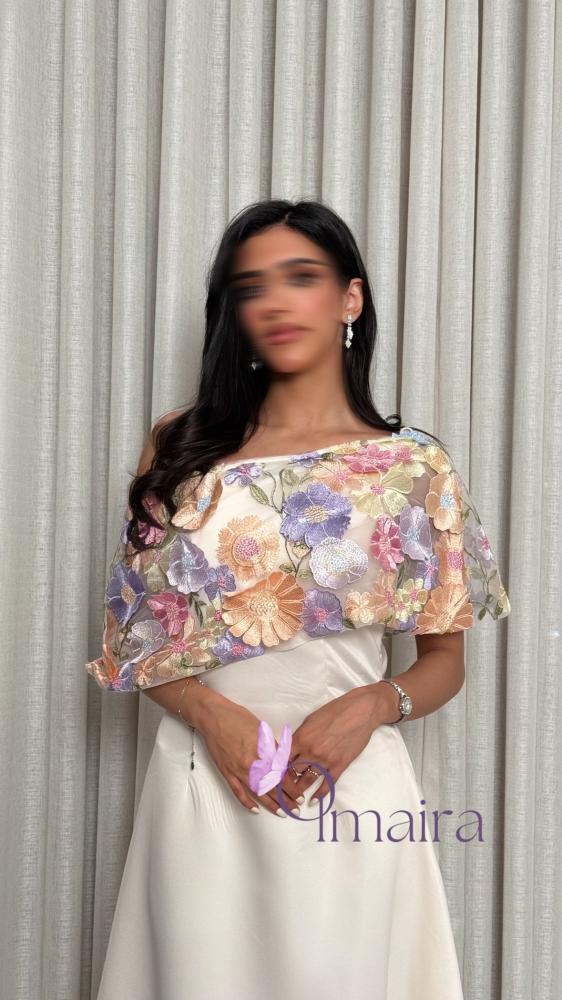 - تدخيلة ورود أنيقةعلي فستان اوف شولدر منفوش : تضفي لمسة فنية فاخرة تضاهي تصاميم الكوتور.