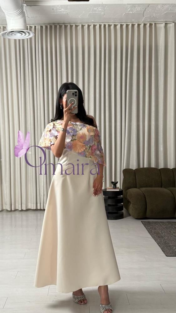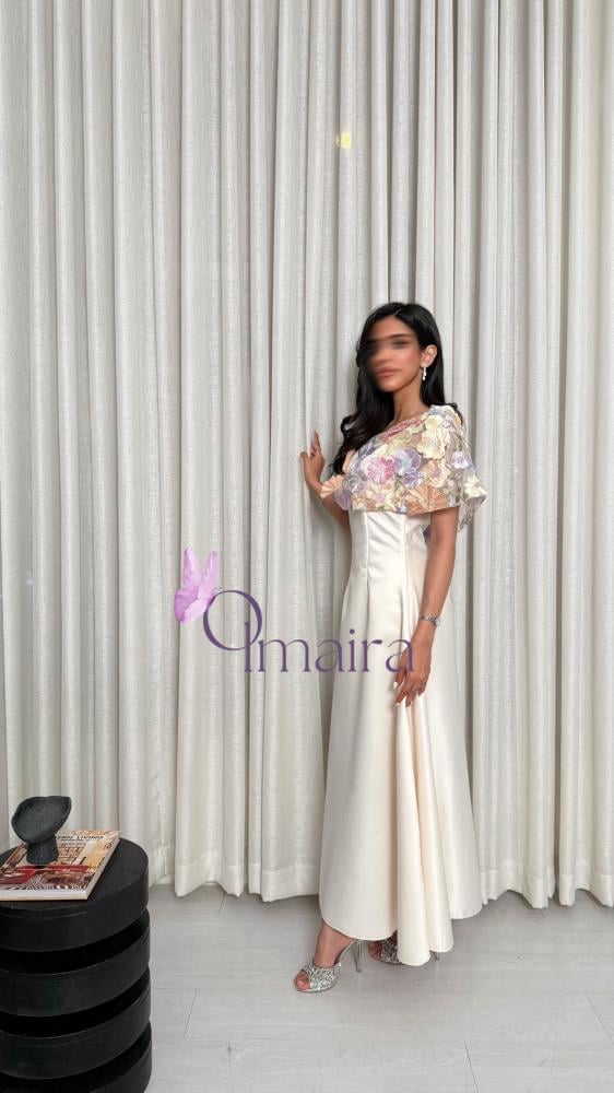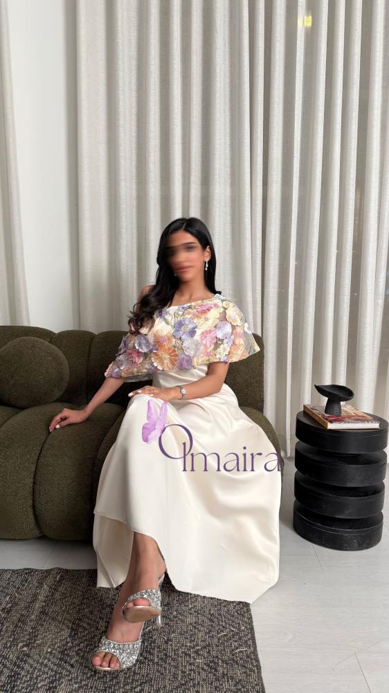 فستان اوف شولدر منفوش. مصمّم خصيصاً لعاشقات الفخامة الناعمة، حيث ينساب برقيّ على الجسم بخامته الفاخرة من الميكادو، ويضفي لمسة فنية راقية بتفاصيل الورود المتناثرة بانسيابية مبهرة.