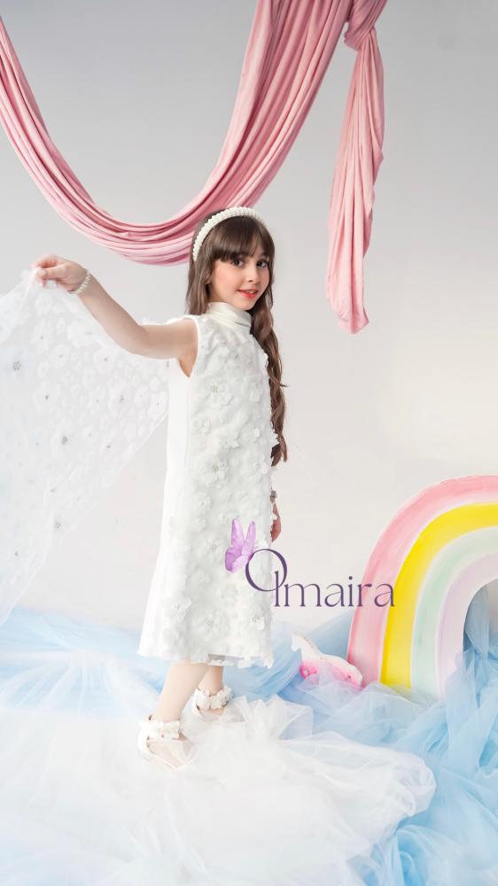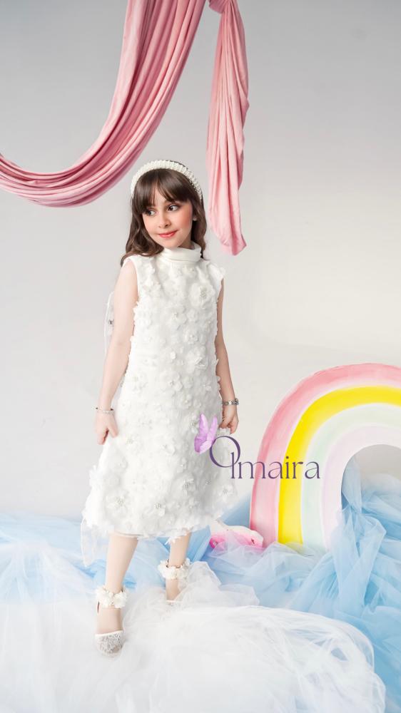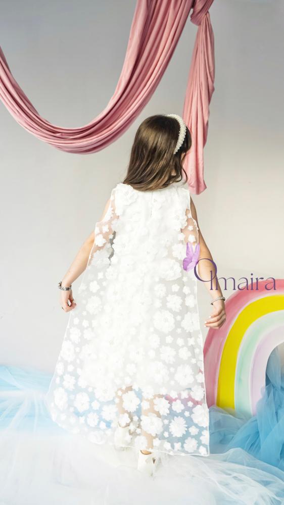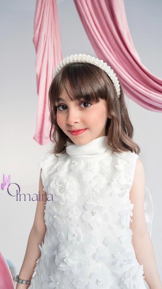 فستان مناسبات بناتي لون أبيض مورد ، الخامه: تل مبطن+ ورد