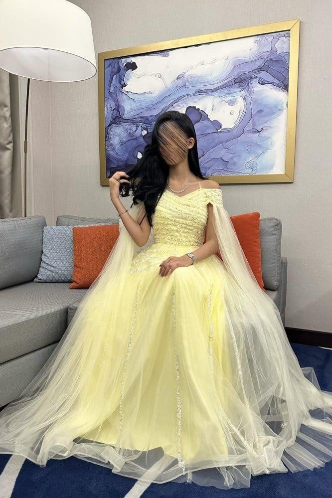 - فستان سهرة ليموني يمتاز بقصة أنيقة تمنحك حرية في الحركة دون التضحية بجمال الإطلالة.